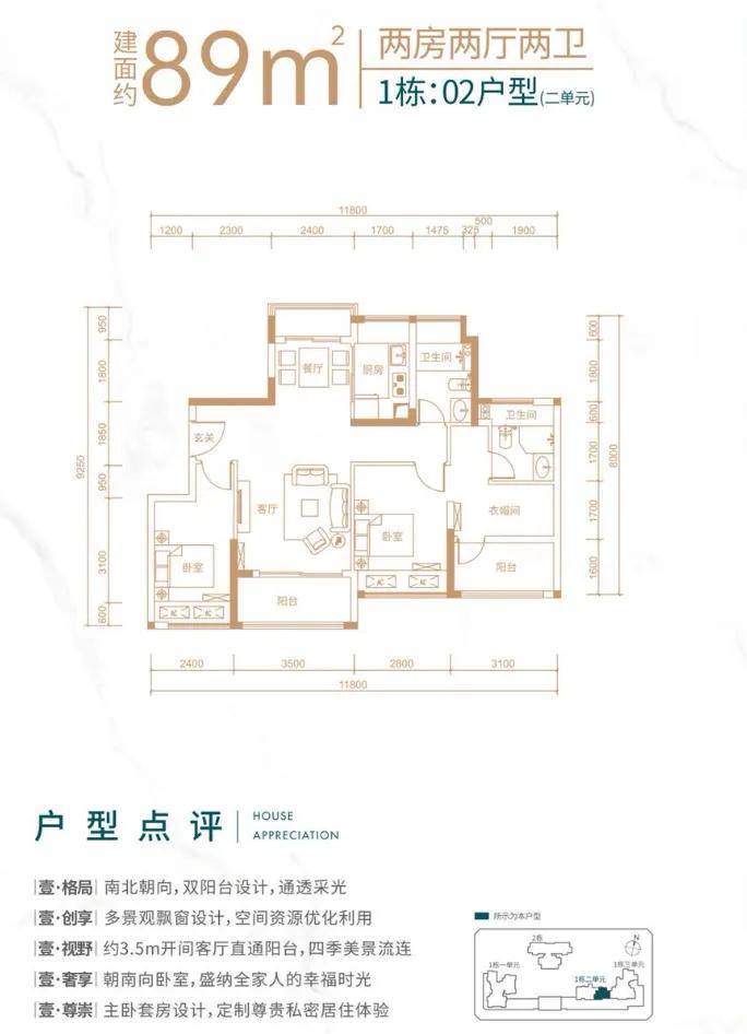 1栋2单元02户,南向通透户型,大开间短进深,所有居住空间南向,通风采光性能*。客厅开间3.5米带,有嵌入式阳台。主卧自然通透功能全面,居住空间开间进深比良好,空间利用充分。功能空间北向,采光充足。餐厅可向生活阳台扩展,入户玄关有良好的功能空间。