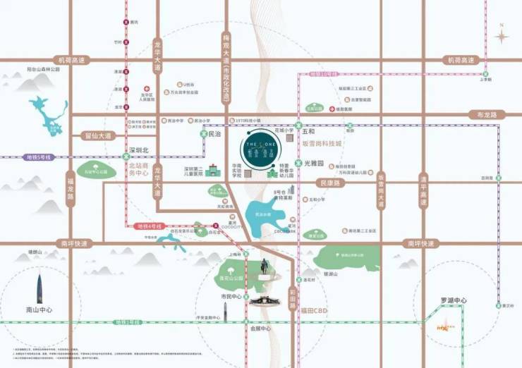 项目位于深圳中轴北段,地处深圳北站商务中心、坂雪岗科技城、福田CBD三大中心交汇处,教育、文化、生态、商业、娱乐休闲等多元价值荟萃,远见美好未来。