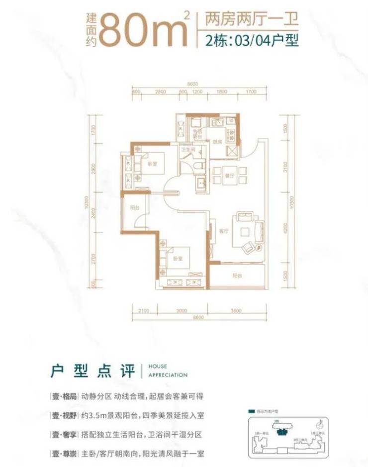 客厅朝南带阳台,主卧朝南,次卧朝西 该户型分布在2栋03,04号房