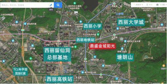 鼎胜金域阳光家园西侧为西丽留仙洞总部基地,东北侧为大学城,东侧为塘朗山,西南侧是西丽高铁站。
