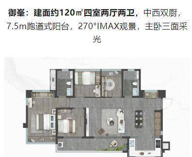 豪华四房(约120㎡):配备中西双厨、7.5米跑道式阳台及270°全景视野,营造极致居住体验。