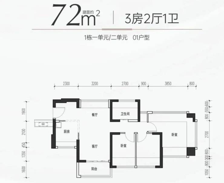 72㎡的3房2厅1卫,设计的是竖厅南北通透格局,进门独立玄关,LDKB一体化,主卧270°飘窗设计,L型厨房,卫生间干湿分离,得房率约100%(包含赠送),阳台主朝东北向。