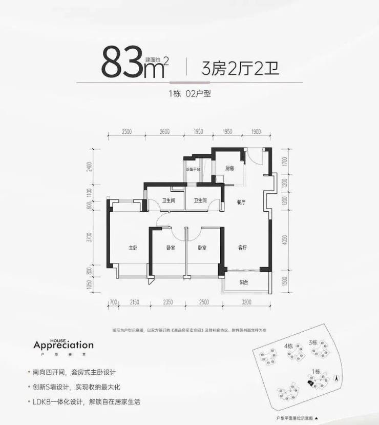 82㎡的3房2厅2卫,03户型,设计的是竖厅格局,进门独立玄关,LDKB一体化,S墙设计预留冰箱卡槽位,主卧双飘窗设计,L型厨房,卫生间干湿分离,得房率约100%(包含赠送),西南朝向。