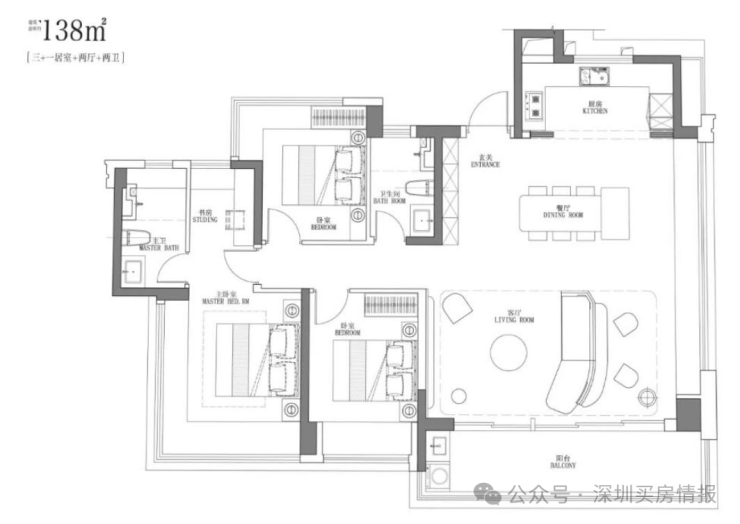 竖厅南北通透格局,进门入户玄关,客厅4.5米开间,餐客厅分离设计,四开间朝南,全屋七面飘窗,主卧大套间做到了270度转角无柱飘窗,U型厨房,公卫三段式干湿分离,得房率约92.2%(包含赠送),客厅连接次卧出7.4米长的观景大阳台,全部主朝东南向,看大运中心+大运公园景观。