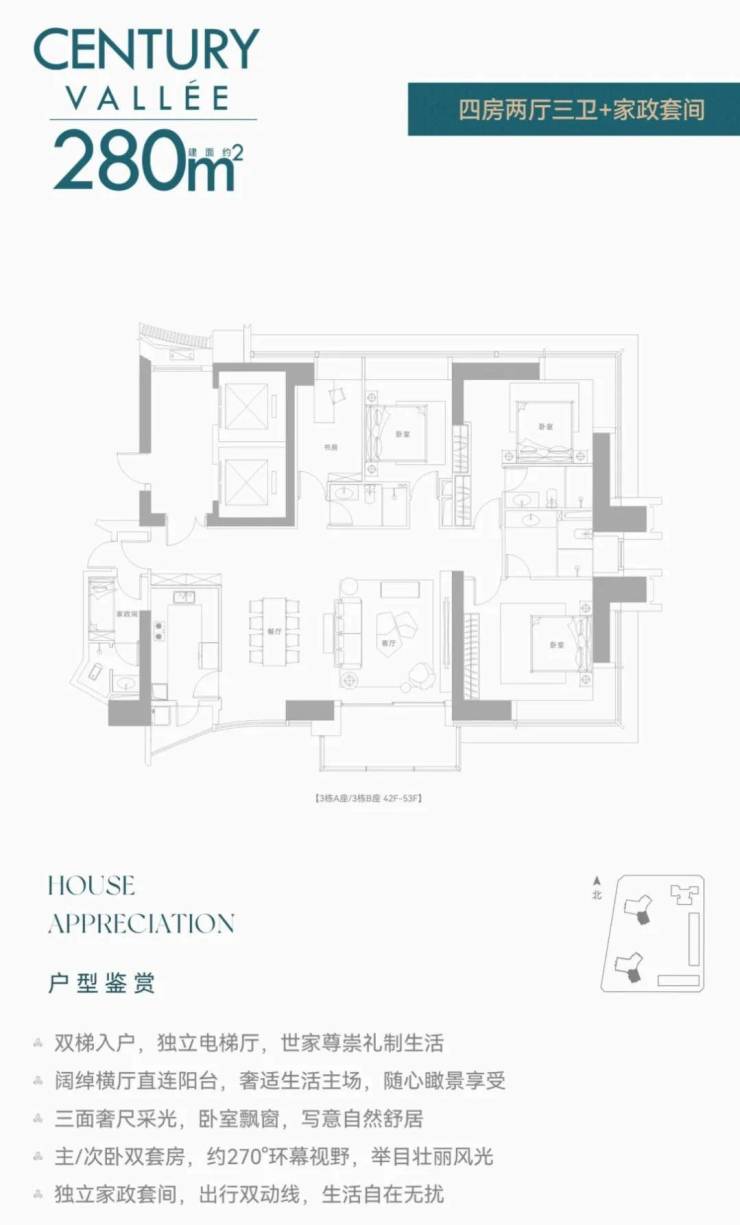 前两次都是公寓,现在住宅首发!还是定位相当高端的纯大平层而且还是无敌景观视野,8梯3户,233㎡/280㎡配备两个独立电梯,386㎡双梯设计,实在任性!