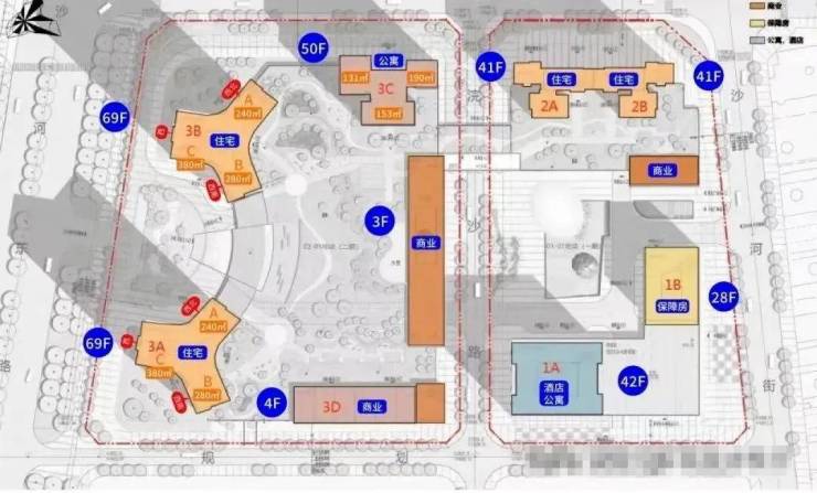 整个项目分两期开发建设,其中:项目一期东地块包含1栋酒店+商务公寓、1栋保障房、2栋包含一、二单元的住宅;西地块包含2栋高约250米的超高层住宅,另有1栋约50层高的商务公寓。