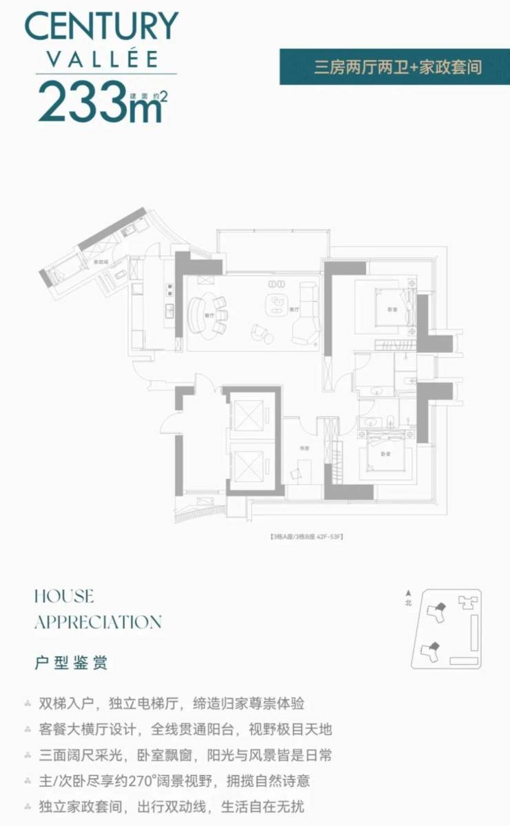 【约233㎡3+1房3卫】双梯入户,独立电梯厅,餐客大横厅贯通阳台,三面采光,主次卧尽享270°环幕视野,还有独立家政套间,西北朝向看名商和沙河高尔夫;