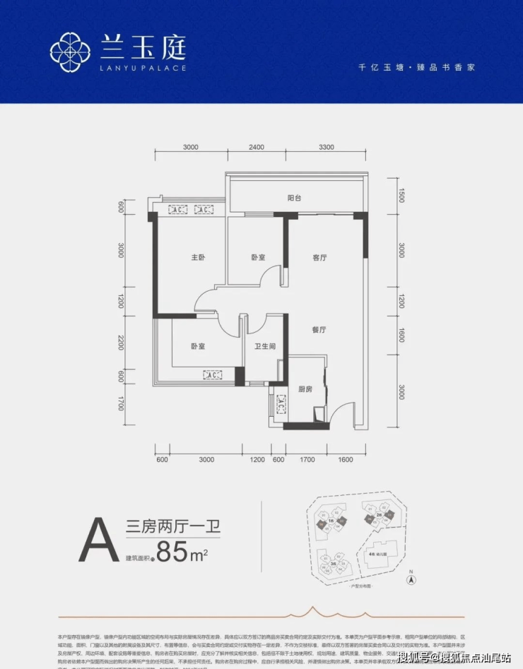 85㎡的3房2厅1卫,A户型,设计的是竖厅格局,客厅开间3.3米,三开间朝南,3个卧室分别做到了主卧12.6㎡/次卧9.82㎡/次卧6.37㎡(套内实测),客厅连接次卧出5.7米长的大阳台,得房率:79.8%(不含赠送),西南或东南朝向。