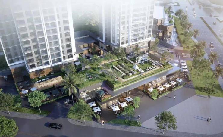 【抬高式檐上浮岛花园露台】:约1000㎡,位于商业街区顶层,业主私享花园露台,提供丰富空间活动区域,是邻里交流娱乐的理想场所。