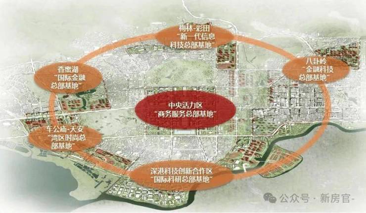 未来,福田除核心外,还将出现香蜜湖国际金融总部基地、车公庙-天安时尚总部基地,深港科技创新合作区、八卦岭金融科技总部基地、梅林-彩田科技总部基地等5大重点发展片区。