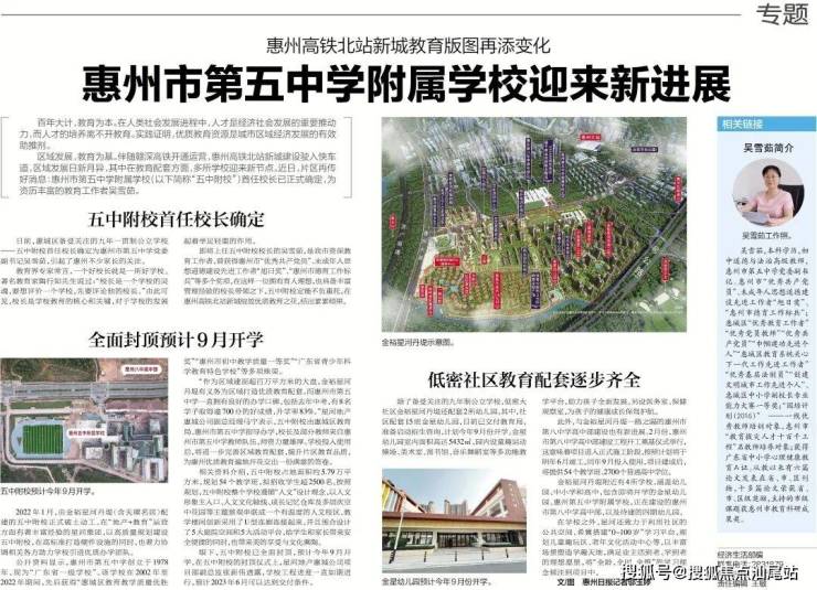 日前,惠州日报官宣,由金裕星河丹堤&天璨配建的九年一贯制公立学校——五中附校首任校长已确定,由惠州市第五中学党委副书记吴雪茹担任。教育界专家常言,一个好校长就是一所好学校。著名教育家陶行知先生说过:“校长是一所学校的灵魂,要想评价一个学校,先要评论他的校长。”由此可见,校长是学校教育的核心和关键,对与学校的发展起着举足轻重的作用。即将上任的吴雪茹校长,是我市资深教育工作着,曾获得惠州市“优秀共产党员”、未成年人思想道德建设先进工作者“旭日奖”、“惠州市教育工作标兵”等多个奖项。在这样一位拥有育人思想,也具备丰富管理经验的校长带领之下,五中附校定能不负重托,在惠州高铁北站新城绽放优质教育之花,结出累累硕果。