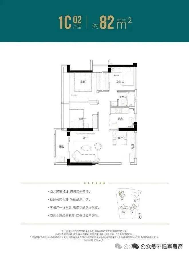 82㎡的3房2厅1卫(1栋C座01户型),设计的是竖厅南北通透格局,客厅3.6米开间,三开间朝南,动静分区,L型厨房,得房率:77.27%(不含赠送),阳台西南朝向。