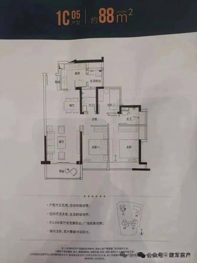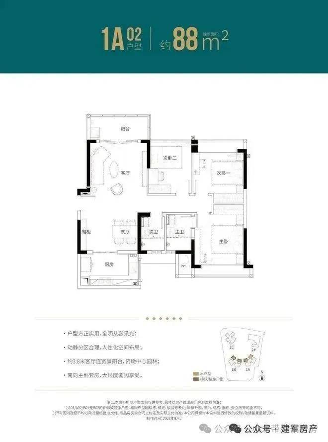 88㎡的3房2厅2卫(1栋A/B座01.02户型),设计的是竖厅南北通透格局,客厅3.8米开间,动静分区,主卧大套间设计,U型厨房,得房率:79.61%(不含赠送),阳台主朝西北向。