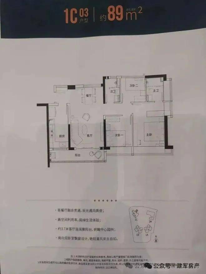 89㎡的3房2厅2卫(1栋C座03户型),设计的是竖厅南北通透格局,客厅3.6米开间,动静分区,主卧大套间设计,超大L型厨房,得房率:77.27%(不含赠送),阳台主朝东南向。
