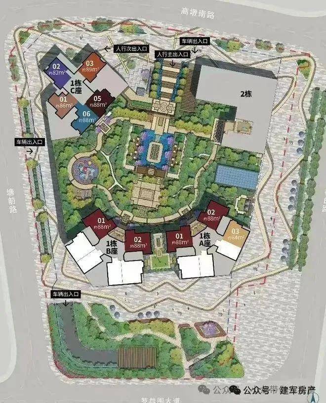 楼栋分布:南区包含 3 栋住宅和 1 栋公寓,北区有 9 栋高层住宅(已封顶)。