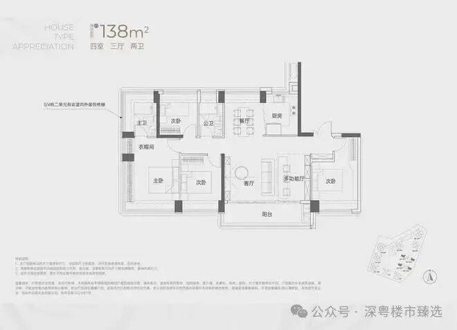 竖庭格局,西南向,基本居住功能与建面约108-110㎡4房2卫一致,但格局不一样,从目前公布的户型图上看,主要是主卧空间有了更大的提升,比如可以放更大一点的衣柜。但从位置上看,它所在的楼栋更靠近主干道,会有噪音影响。