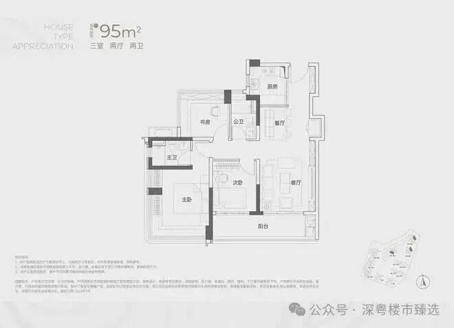 该户型为西南向(部分户型看海)或东北向看山景,是传统的竖庭格局,南北通透。最大亮点是,阳台从客厅对出连通到次卧,显得比较宽敞。特别是对于三代同堂的家庭,适合老人早期锻炼。