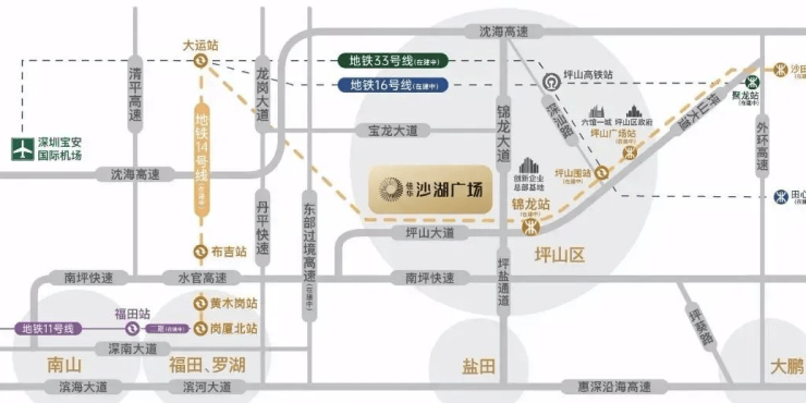 地铁:紧邻地铁14号快线坪山门户站——锦龙站700米(已通车),12站福田岗厦北。地铁16号线(预计2022年内通车)、地铁33号线(在建)
