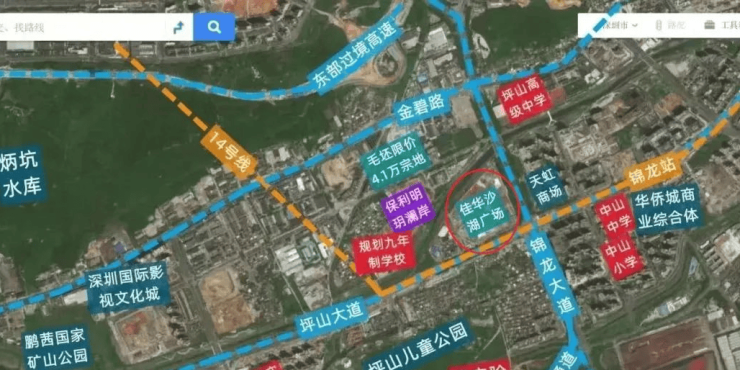 佳华沙湖广场项目位于坪山区坪山大道与锦龙大道交汇处西北角,项目是包含商业、办公/公寓、住宅、幼儿园于一体的大型综合体,总建面超62万㎡。隔壁是深业国际东城、力高君御国际等住宅区。