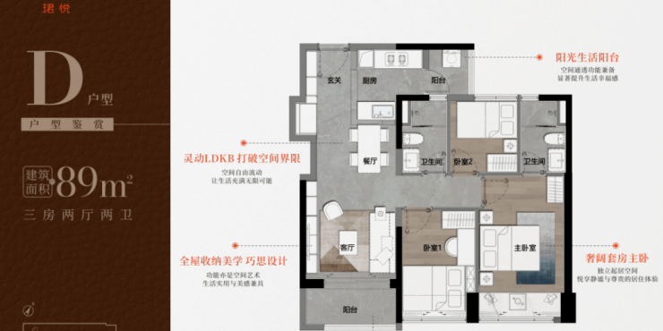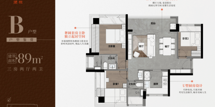 - 89㎡三房:采用竖厅或横厅布局,三开间朝南,动静分区明确,U型厨房与三段式公卫提升实用性。部分户型配备5.6米观景阳台,主卧双飘窗设计增加采光。