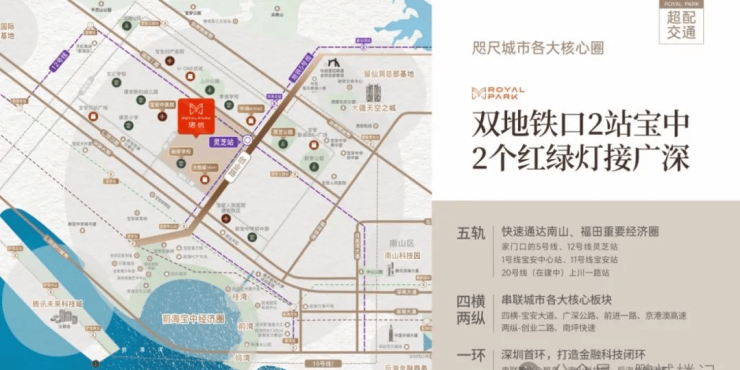 珺悦名都地处宝安老城核心区,紧邻地铁5号线与12号线换乘站灵芝站(直线距离200-400米),2站直达宝安中心,5站至前海湾,12号线串联南山、蛇口等核心商务区,通勤效率极高。此外,项目毗邻创业二路、广深公路等主干道,自驾至南山约15分钟,福田30分钟,交通辐射能力显著。