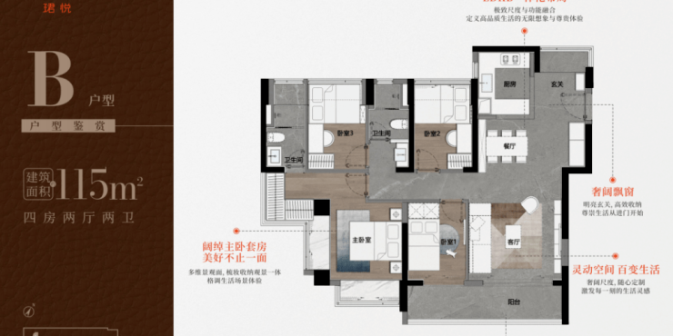 项目主打89㎡三房与115㎡四房,全部为精装交付,户型设计注重功能性与空间利用率: