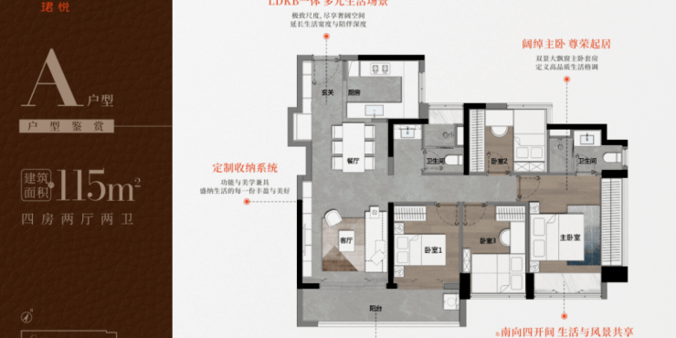 - 115㎡四房:四开间朝南,6.2米巨幕阳台,主卧双飘窗,部分户型实现南北通透,适合改善型家庭。