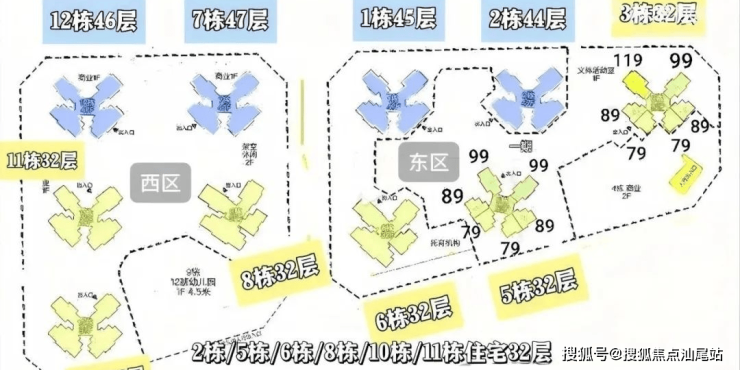 西区:占地2.2万㎡,容积率5.16,包含住宅、商业、幼儿园学校和其它基础配套设施。7栋47F,12栋46F,3T6户;8栋32F,2T5户;10/11栋32F,2T6户;9栋幼儿园。