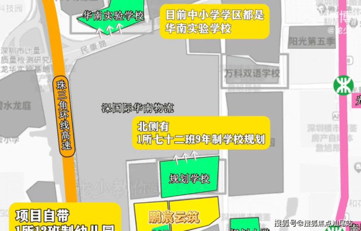 学校:项目北侧规划有广东省一级学校建设标准的72班九年一贯制学校,还有18班小学规划,近邻华南实验学校、万科双语学校。目前小学、初中学区都是华南实验学校。