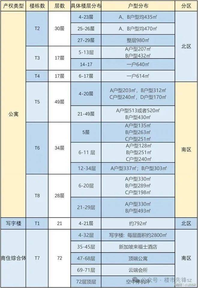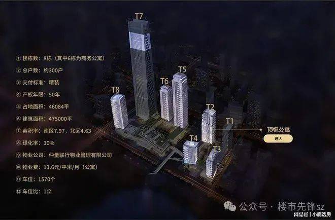 总共8栋,分为南北区。北区分为:T1写字楼、T2、T3、T4公寓。南区分为:T5、T6、T8公寓,T7为环球商务中心。