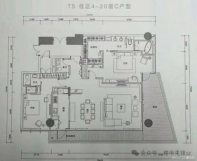 T5栋低区4-20层240m2C户型,由2个套房+2厅+厨房+书房+工人房组成,户型方正,客厅出V字型双阳台,阳台朝东和朝南,采光较好,视野非常开阔,但南面的景观资源比较一般。不足之处在于没有实现主佣分区,动静分区不明显。