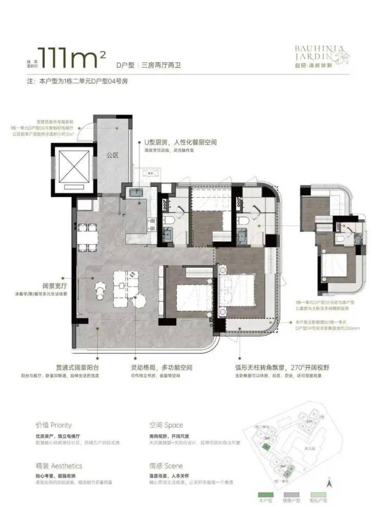 小区有485套纯住宅,车位595个,容积率5.14,共有三栋住宅,每栋做了36-37F高的4梯5户设计,每户都有专梯入户空间。