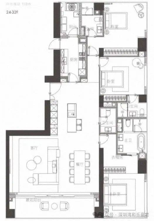 - 空间布局:客厅宽敞明亮,与餐厅、阳台一体化设计,延展了空间感。厨房可采用中西厨结合的设计方式,满足不同烹饪需求。四间卧室中,三间套房均配备独立卫浴和衣帽间,方便又舒适。