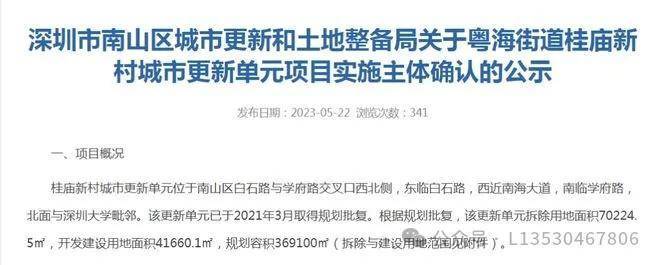2023年5月时候,南山区城市更新和土地整备局发布关于粤海街道桂庙新村城市更新单元项目实施主体确认的公示。