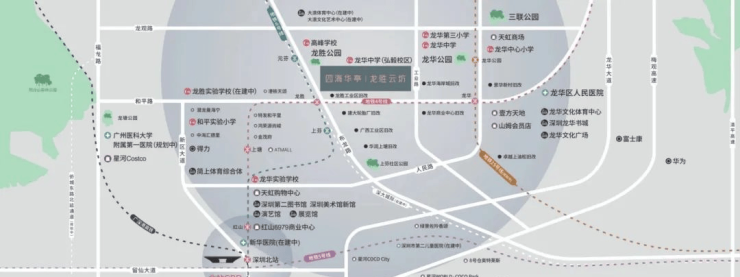 •百年高峰学校(龙华区公立四大、十大录取率排名前三)、龙华中学弘毅校区(广东省一级)、龙华中学中心校区(广东省一级)、龙华第三小学(公办32班小学)、项目配建幼儿园等