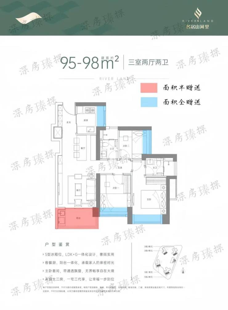 95-98㎡的3房2厅2卫,3栋04.05户型,设计的是经典竖厅格局,客厅3.5米开间,LDKB一体化,S墙设计预留冰箱位,三开间朝南,3个卧室分别做到了主卧12.93㎡/次卧8.64㎡/次卧6.21㎡(套内面积,包含墙体),U型厨房,得房率:71.47%(不含赠送),阳台1.6米进深,东南朝向。套内面积69.45㎡+赠送面积7.57㎡=实得77.02㎡,加上赠送后得房率约79.25%。