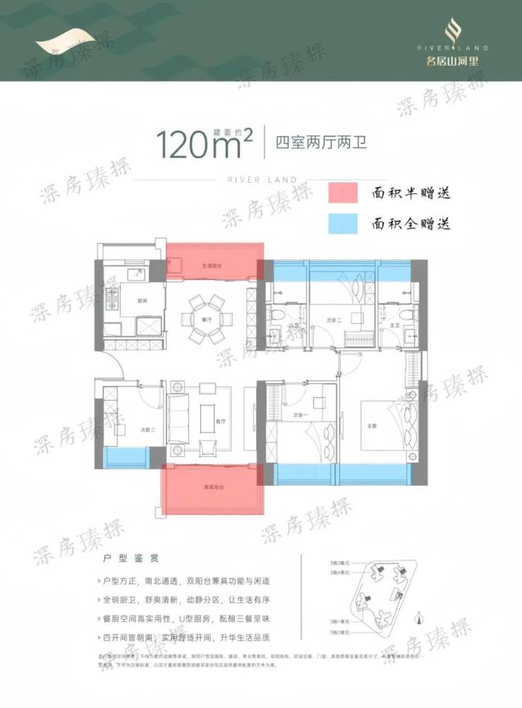 141㎡的4房2厅2卫,仅3栋2单元01户型,设计的是竖厅格局,客厅4.2米开间,南北通透双阳台,四开间朝南,全屋飘窗,4个卧室分别做到了主卧18㎡/次卧11.1㎡/次卧9.25㎡/次卧8.99㎡(套内面积,包含墙体),U型厨房,得房率:73.05%(不含赠送),大阳台主朝东南向。套内面积103.23㎡+赠送面积13.58㎡=实得116.81㎡,加上赠送后得房率约82.66%。