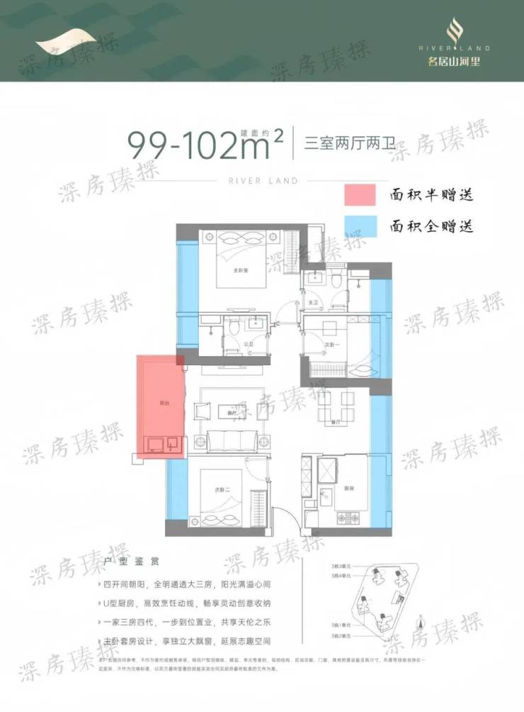 99-102㎡的3房2厅2卫,3栋02户型,设计的是竖厅南北通透格局,客厅3.4米开间,四开间朝南,全屋飘窗,3个卧室分别做到了主卧14.82㎡/次卧10.78㎡/次卧7.44㎡(套内面积,包含墙体),U型厨房,得房率:73.04%(不含赠送),阳台1.6米进深,主朝西南向。套内面积72.82㎡+赠送面积10.19㎡=实得83.01㎡,加上赠送后得房率约83.26%。