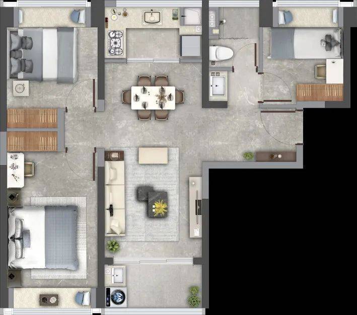 B户型是约70㎡两房两厅一卫,精巧两房布局、270°宽景阳台,尽享私密时光;