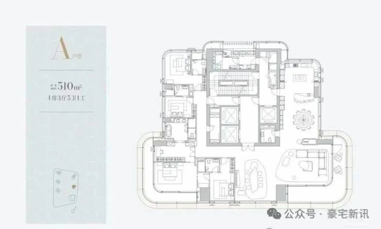 1A栋(1栋一单元)-43层:3梯1户,约510㎡,一层一户,私密性极致,为项目旗舰户型。
