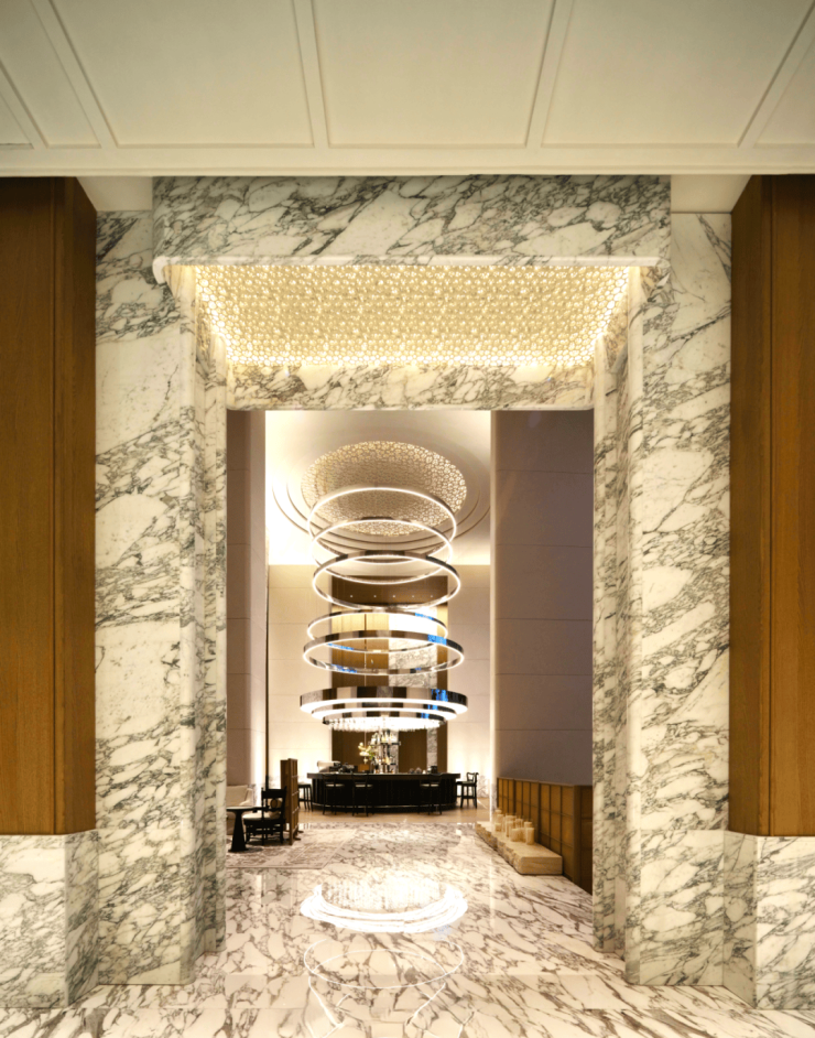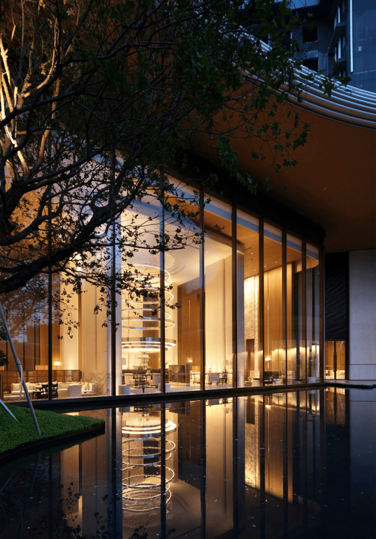 大门内侧直达9 米超高挑高车马厅,豪宅标配落客仪式,车行直达地下、人行步入园林完全分流;穹顶弧形天花 + 嵌入式灯光系统,中央镜面水景,藏风生水起之意,光影静谧高级。