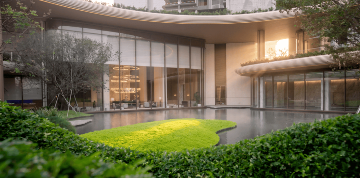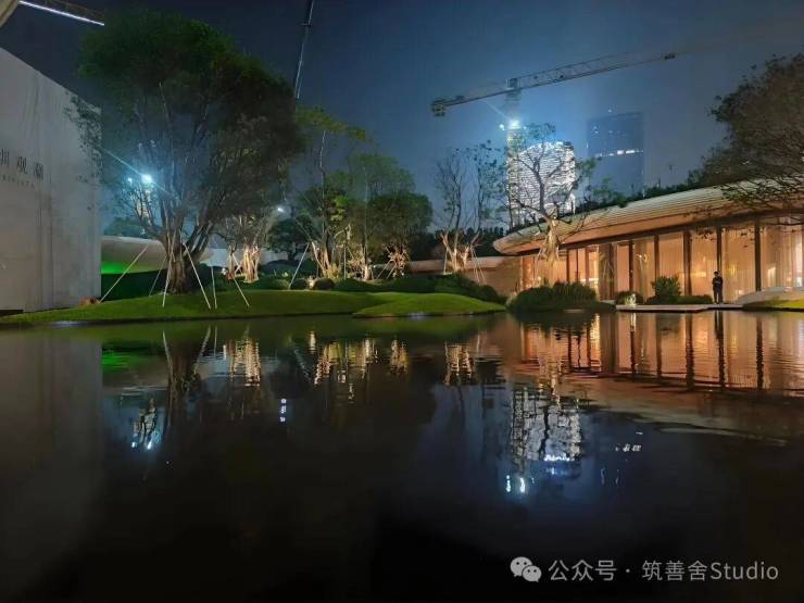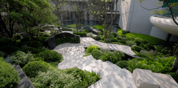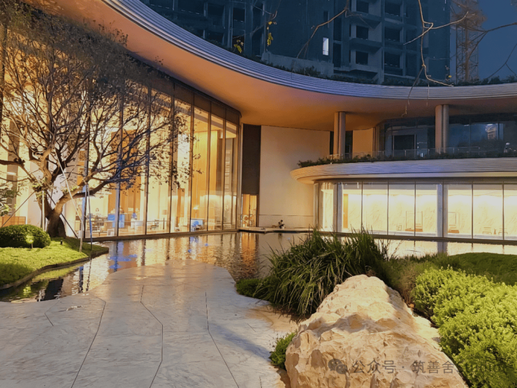 项目核心景观为5.5 万㎡三层立体台地园林,展示区即中央下沉庭院,是整个社区景观灵魂,设计理念:一心十岛、浮屿藏海、山谷秘境。展示区采用双下沉山谷式设计,区别于平面园林,利用场地高差打造高低错落、内外通透的立体景观;中央约 800㎡镜面无边水景,模拟前海潮汐海面,是展示区视觉核心;整体抬地 12 米(三层架空底盘),住宅首层相当于市政地面三层高度,完全避开道路噪音、俯瞰园林海景。全冠移植名贵乔木、多层次乔灌草,滨海耐盐树种,营造森海秘境氛围;大面积弧形石材、水洗石、木纹铝板,柔和曲线呼应海浪形态,拒绝生硬直角。