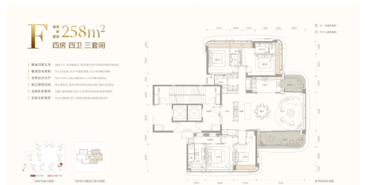 257/330㎡大平层:楼王产品,270° 环幕海景,大方厅 + 中西厨,三套房奢适布局。