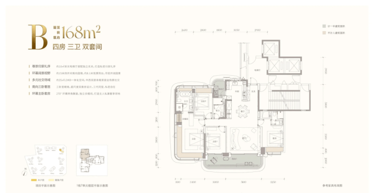 168/188㎡四房三卫:主力爆款,大横厅 + 南向超长阳台,双套房,直面园林海景。