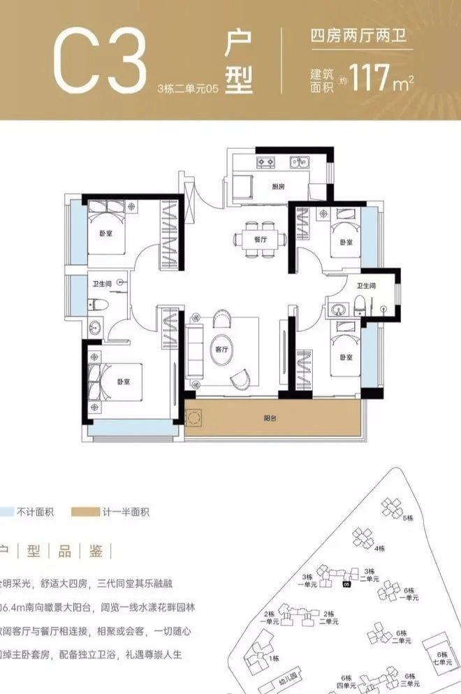 117㎡的4房2厅2卫(C3),设计的是竖厅南北通透格局,客厅3.9米开间,L型厨房,得房率:72.06%(不含赠送),约6.4米长的超大阳台,正南朝向看花园景观。