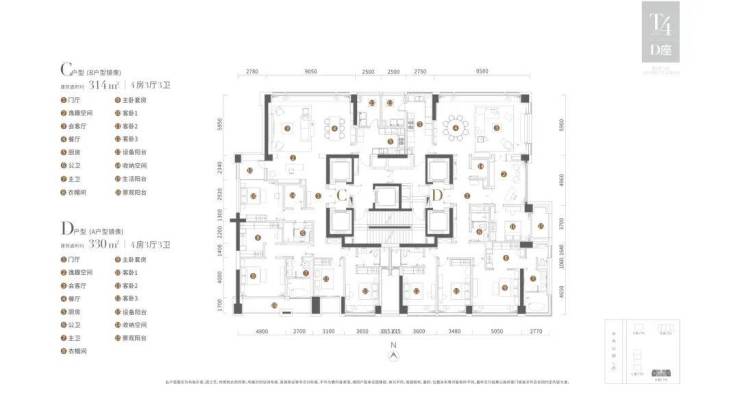B/C户型:330m²四房三厅四卫,南北通透(卧室全南向)