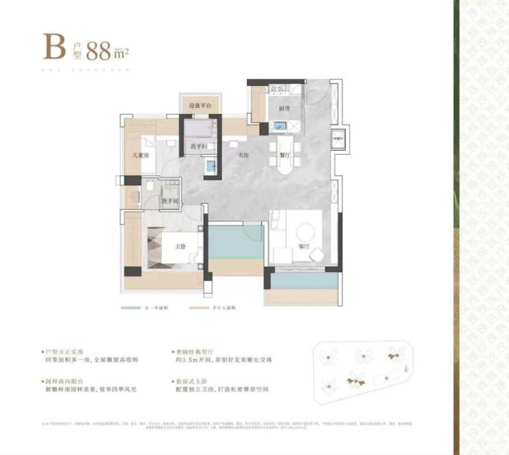 实际使用率(含赠送)在95%左右,相比建筑老规设计,得房率高了10%。79㎡就能做到三房二卫,89㎡能做到四房二卫,99-119㎡四房二卫。