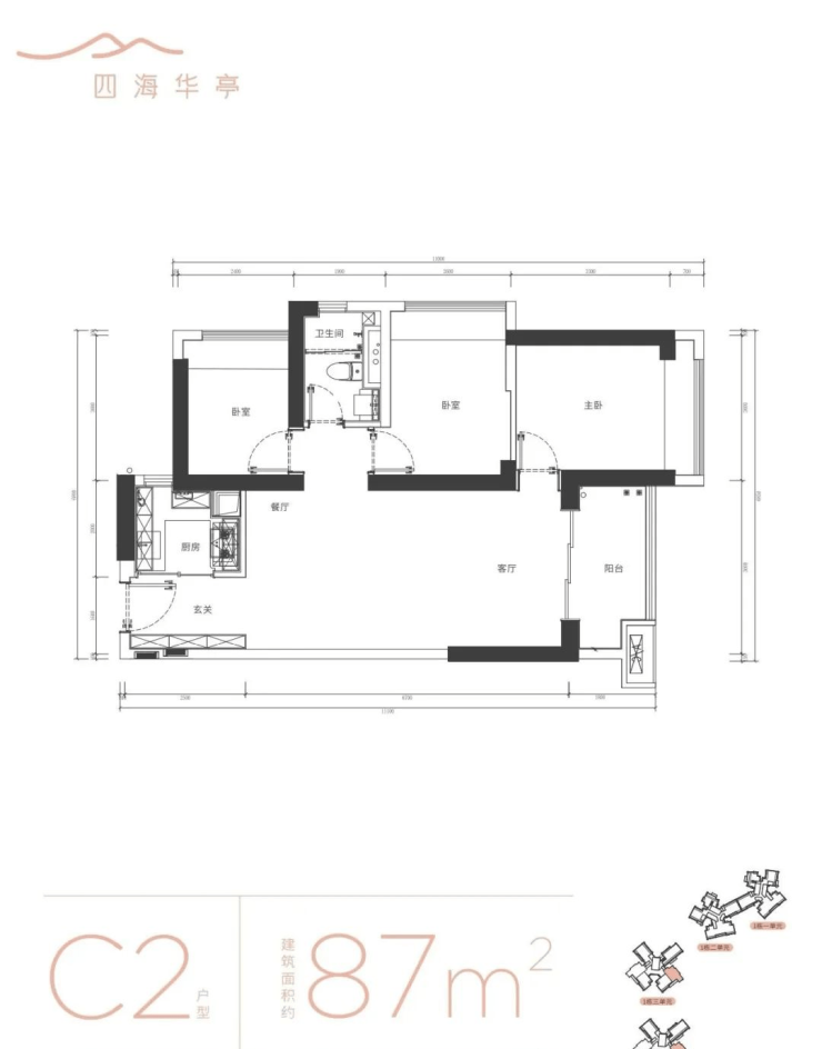 【C2-建面约87㎡】客餐厅一体化空间,动静分离式布局,超长玄关收纳柜体