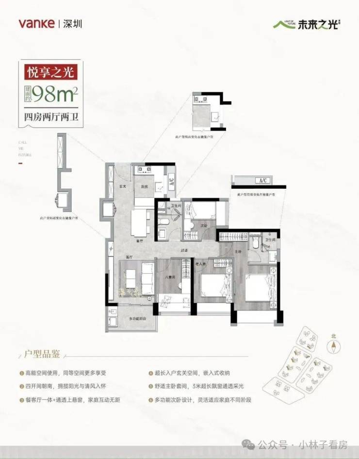 1、户型设计,73㎡可做三房一卫,80㎡做三房两卫,98㎡做四房两卫,这面积段和户型一看在深圳项目里是很稀缺的,看似面积小实际上因为小高层的设计,使用率是不输于市面上的其他产品的。