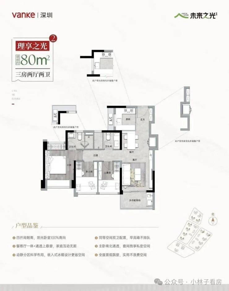 6、户型设计不错,别的开发商80平这个面积段只能做三房一卫,万科做到了三房两卫,功能性立马提升
